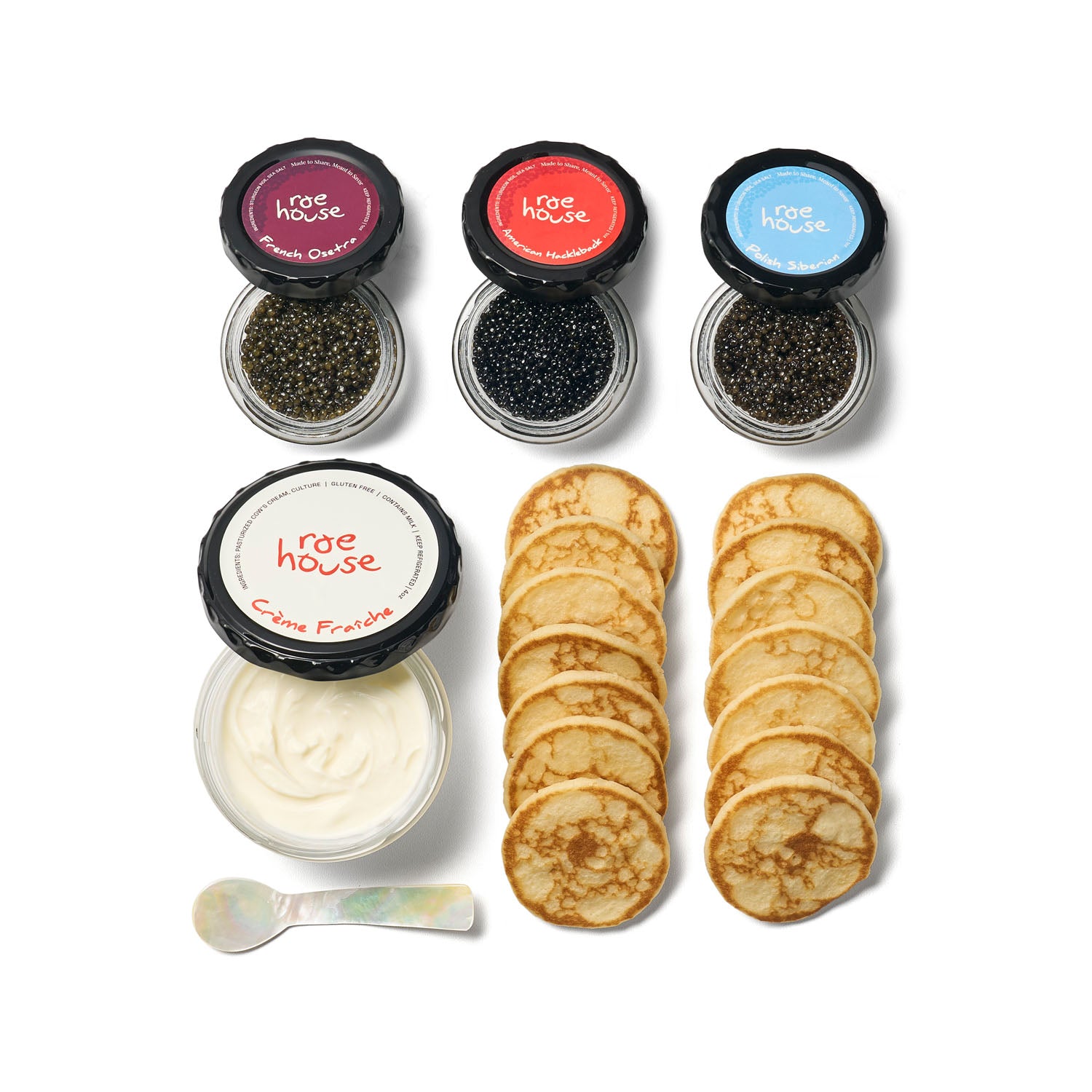 Shop nowOur full lineup: three signature caviars, blinis, crème fraîche, and mother-of-pearl spoons.