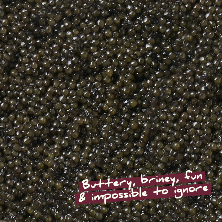 From Parma, Italy (the land of prosciutto and parmesan, yum!), comes this rich, creamy caviar with generous pearls and a delicate briny finish. Its colors range from deep black to soft gray-brown, and the flavor is complex yet silky—like velvet on your tongue.