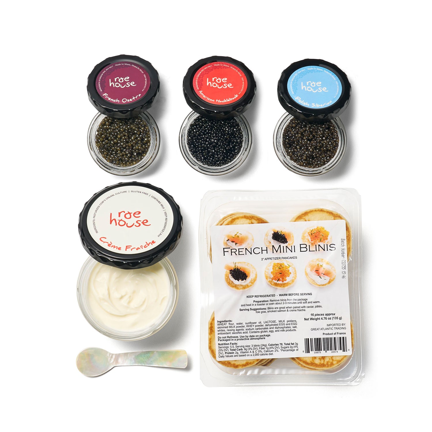 Our full lineup: three signature caviars, blinis, crème fraîche, and mother-of-pearl spoons, ready to turn any night into a proper celebration.